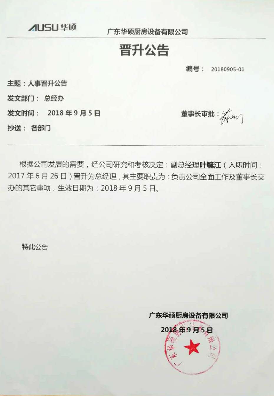 廣東華碩廚房設(shè)備有限公司晉升公告通知